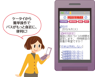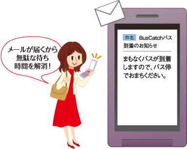 予約したバス停にバスが近づくと、メールで到着をお知らせします。携帯サイトでも現在のバスの状況が確認できます。