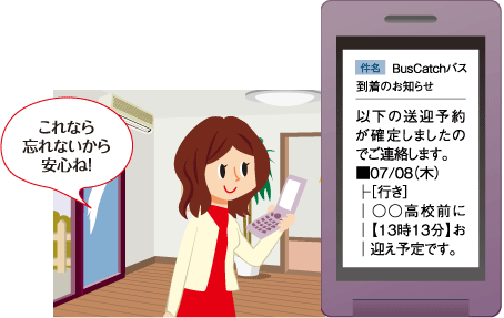 予約した前日(前営業日)の夕方頃に、メールで翌日の送迎時間が届きます。予約時間を忘れたり、なんてことがなくなるから安心です。