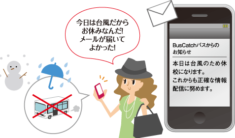 台風や雪などで、送迎バスの運行を中止する場合など、施設からのお知らせメールが届きます。